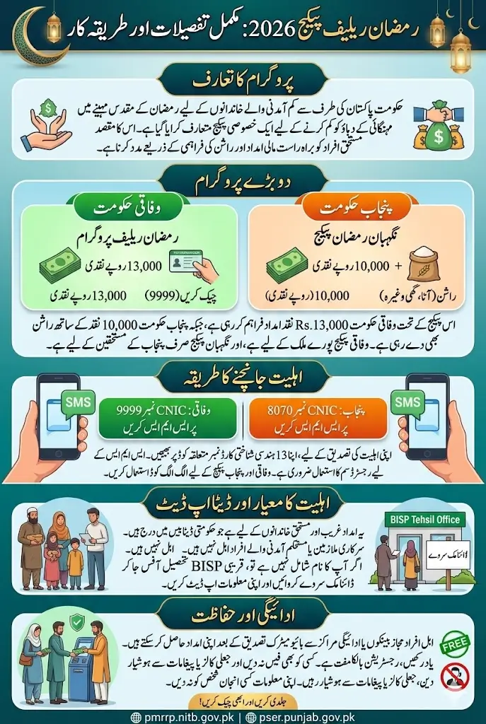 The federal government has launched the Prime Minister Ramzan Relief Package 2026, which provides direct cash assistance to deserving families across Pakistan. Under this initiative, eligible households can receive Rs. 13,000 financial support to help them manage essential expenses during the holy month of Ramadan.